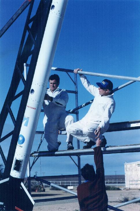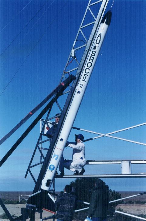 AUSROC I on launch stand. Payload yet to be attached to rocket.